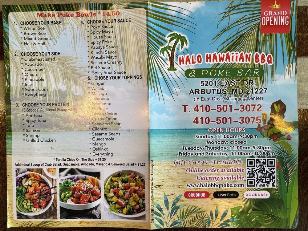 Halo Hawaiian BBQ & Poke Bar offers a delightful combination of Hawaiian poke bowls and barbecue dishes. Located in Arbutus, MD, this women-owned establishment provides a range of options for both dine-in and takeout customers. The menu includes customizable poke bowls, delicious starters like edamame and gyoza, and hearty combination plates featuring BBQ chicken, beef short ribs, and more. Customers rave about the generous portions, flavorful sauces, and friendly service. Diners particularly praise the chicken combo plate, shrimp poke bowl, and gyoza appetizer. With options for outdoor seating, catering, and delivery, Halo Hawaiian BBQ & Poke Bar caters to a variety of preferences and occasions. Whether you're a poke enthusiast or a barbecue lover, this restaurant promises a satisfying and memorable dining experience.
