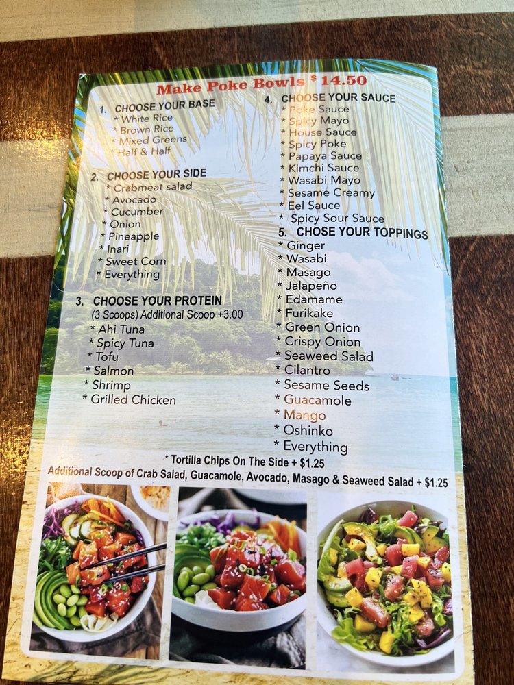 1. Choose your base 2. Choose your side 3. Choose your protein 4. Choose your sauce 5. Choose your toppings 6. Extra topping sauce. Add extra ingredients for an additional charge.